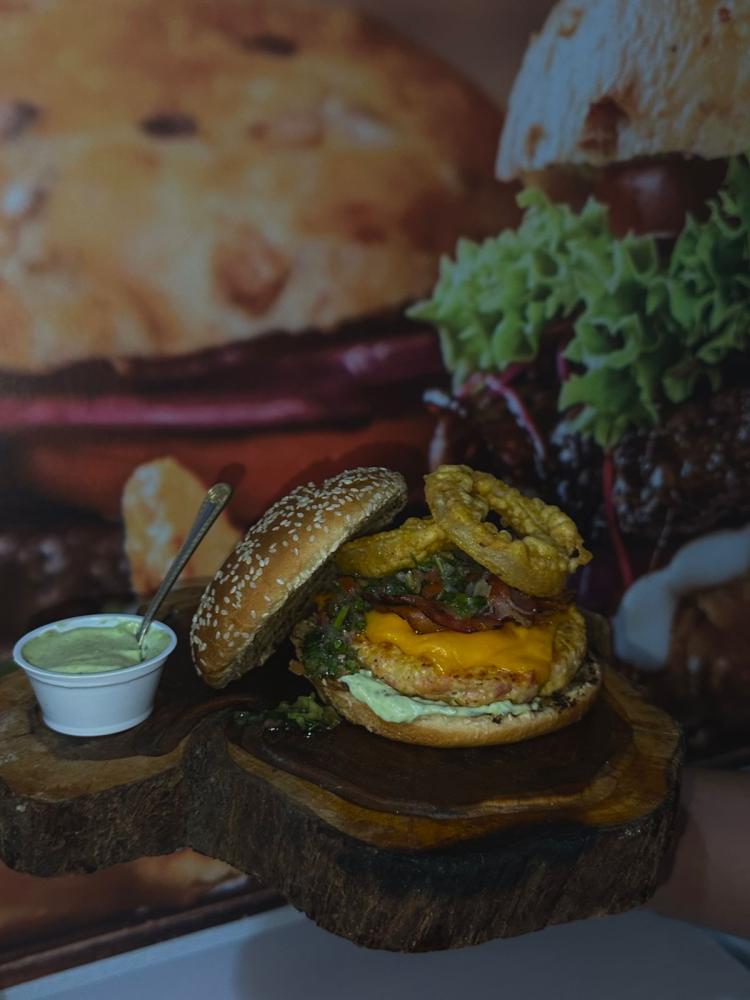 Blade de frango 130 grama, bacon em cubos, pão molho chimichurri, queijo cheddar,anel de cebola (molho da casa)