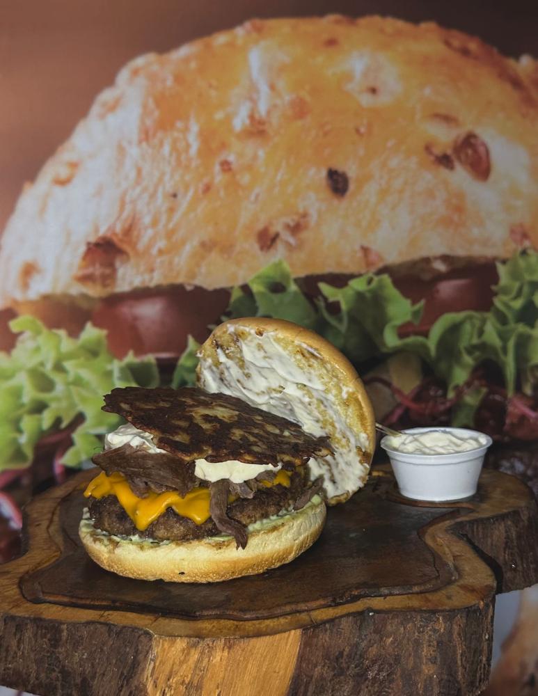 Blade 130 grama, pão, carne de sol na nata desfiada,crosta de queijo coalho (molho da casa)